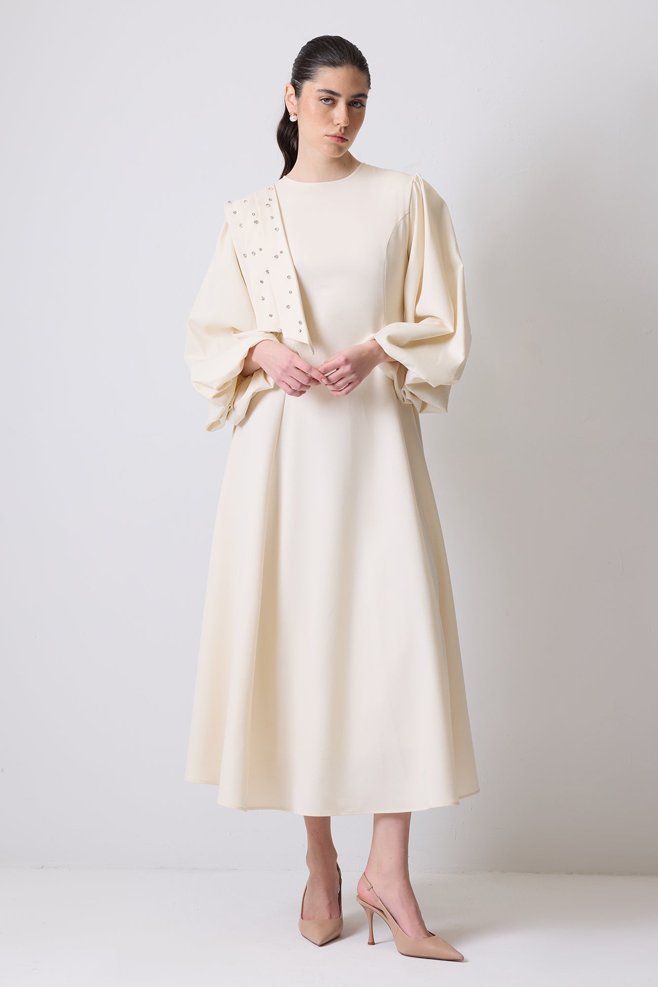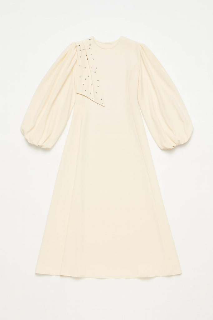 STONE EMBROIDERED BALLOON SLEEVED DRESS