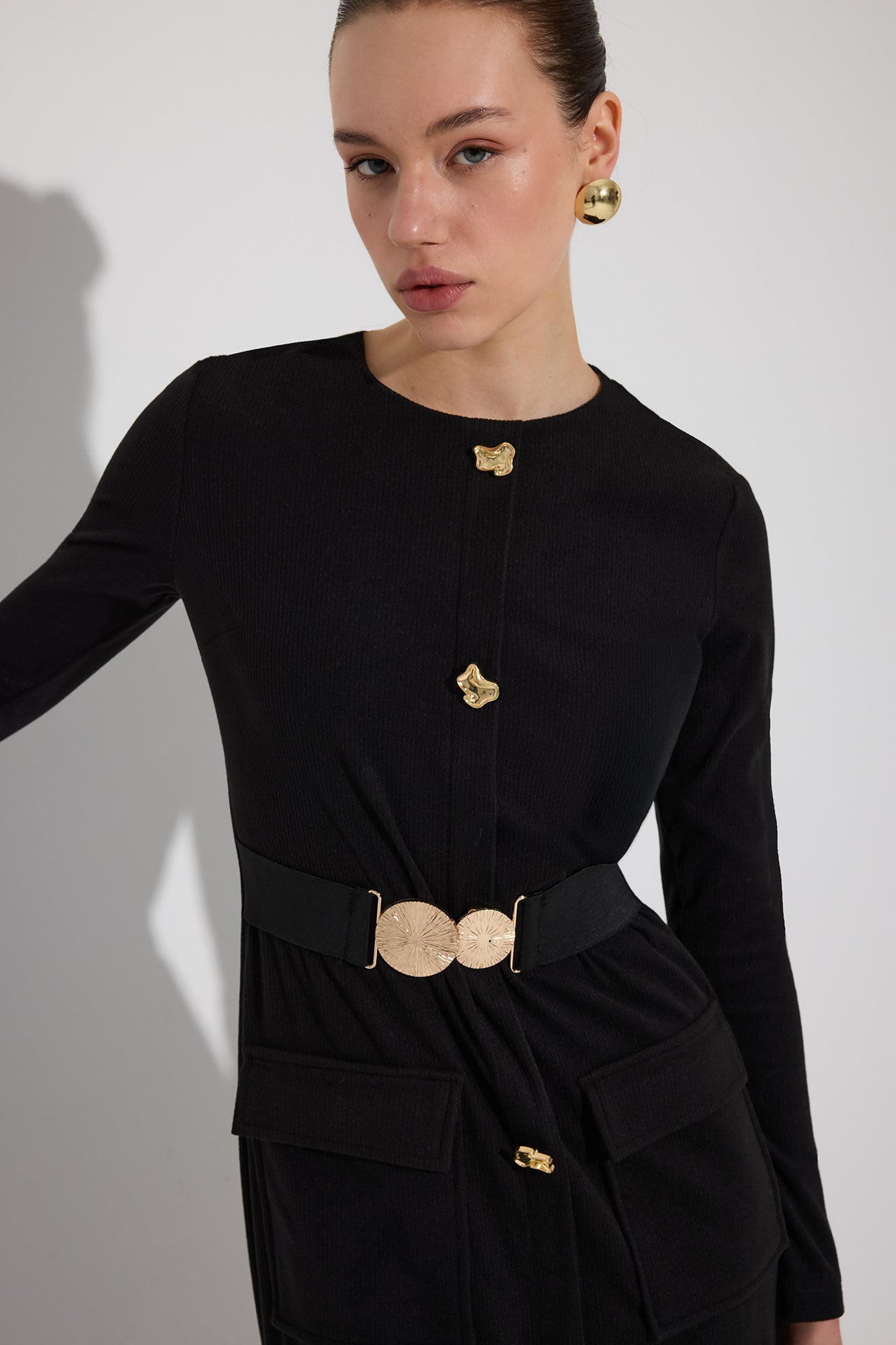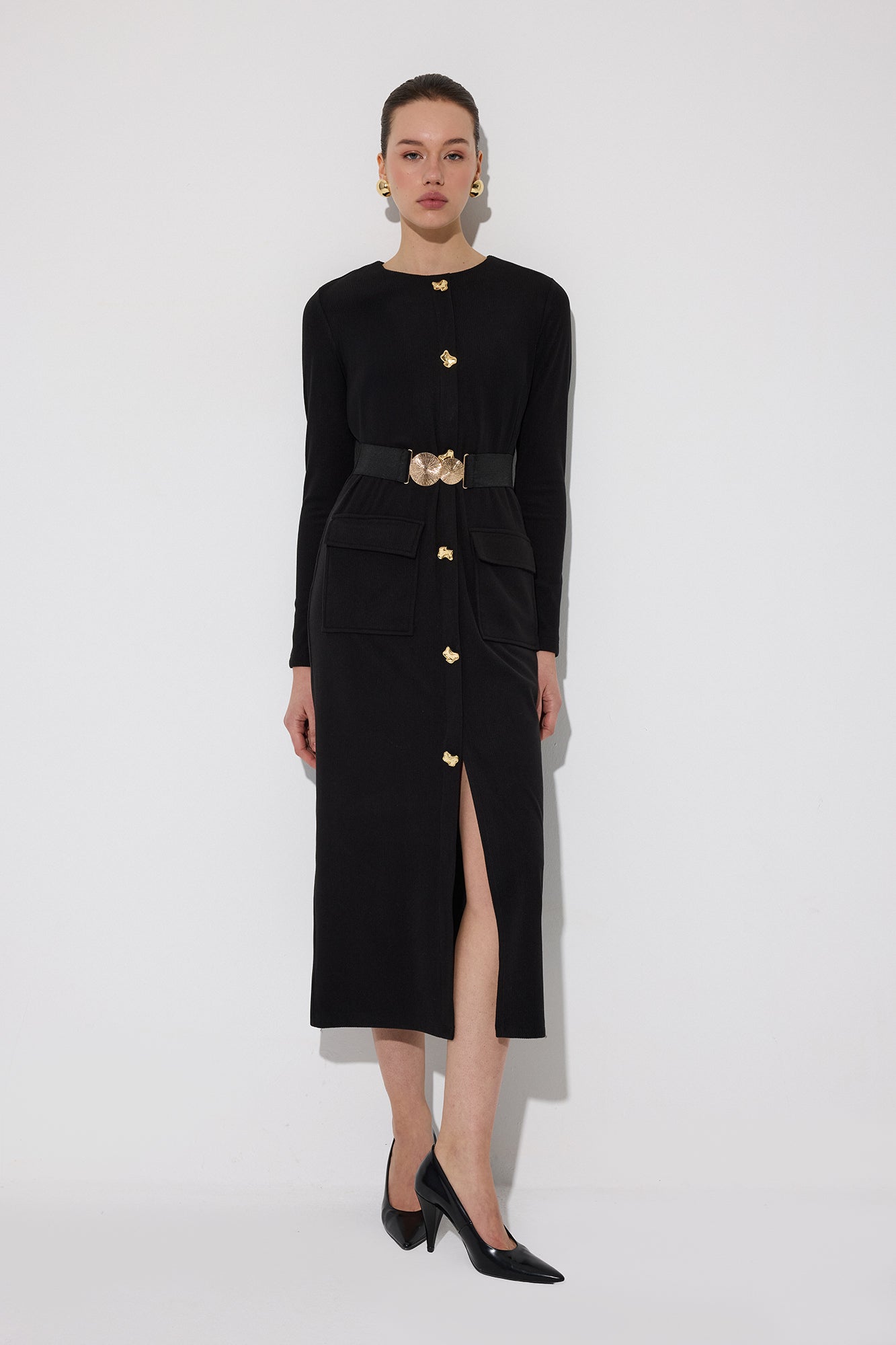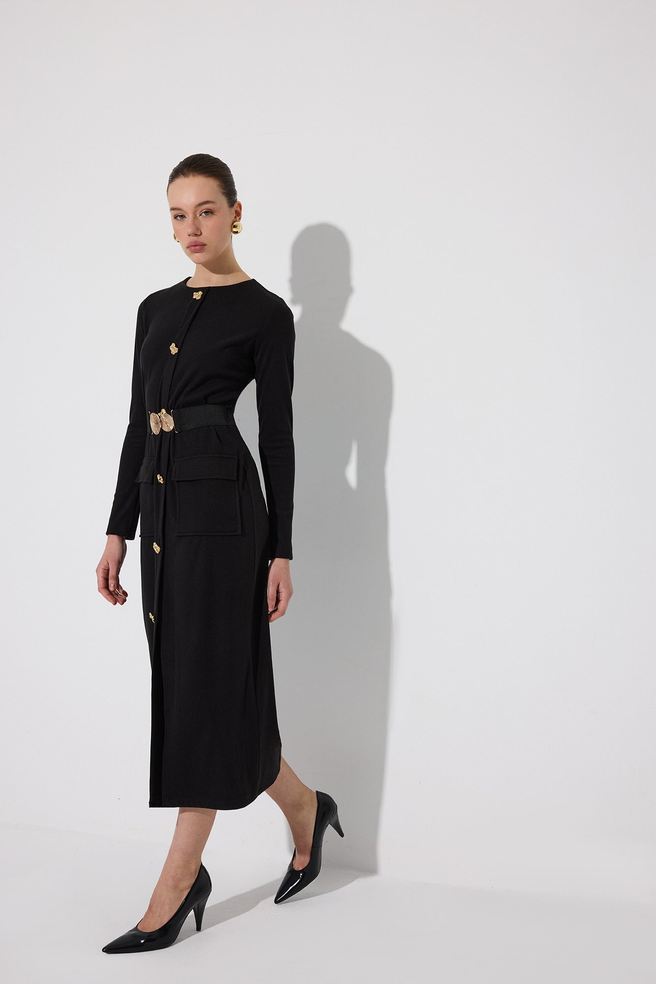 KNITTED DRESS WITH GOLD BUTTONS AND BELT