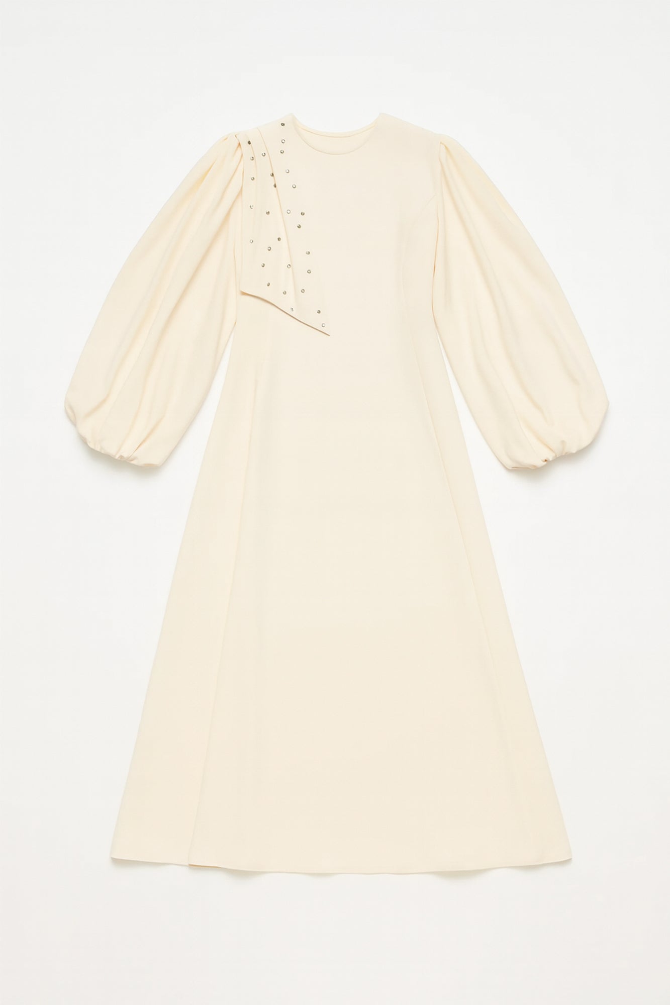 STONE EMBROIDERED BALLOON SLEEVED DRESS