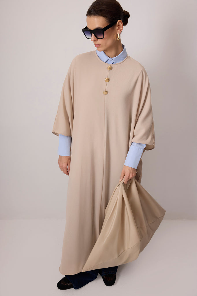İNCİ DÜĞME DETAYLI BÜZGÜLÜ BEL ELBİSE